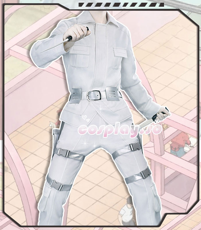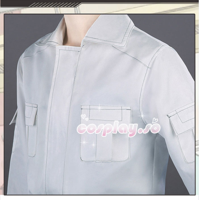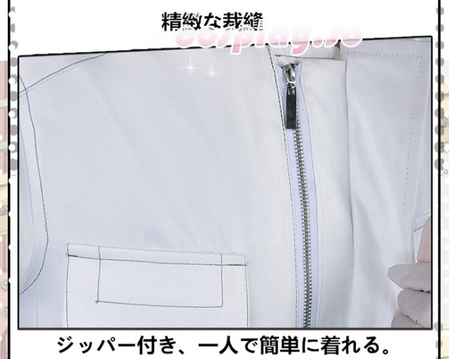 衣装は白い作業衣、丈夫な生地を採用する。服のライン整っている、糸調子がいいです、裁断の形が良い。チャックを付けで着るのが便利だ。