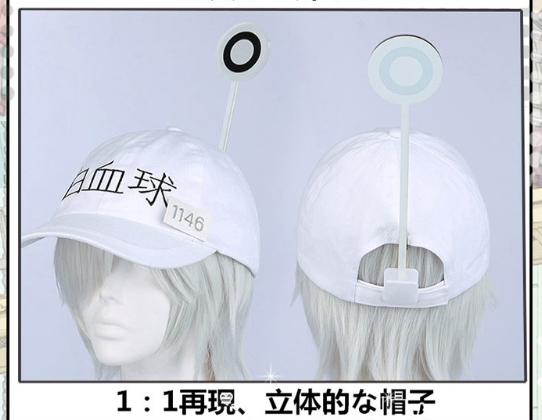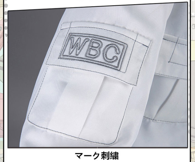 袖の上に刺繍がある、とても巧緻です、白い帽子は「白血球」の文字がある。