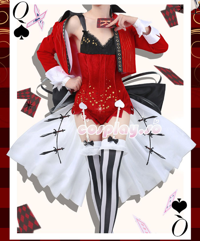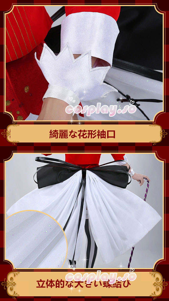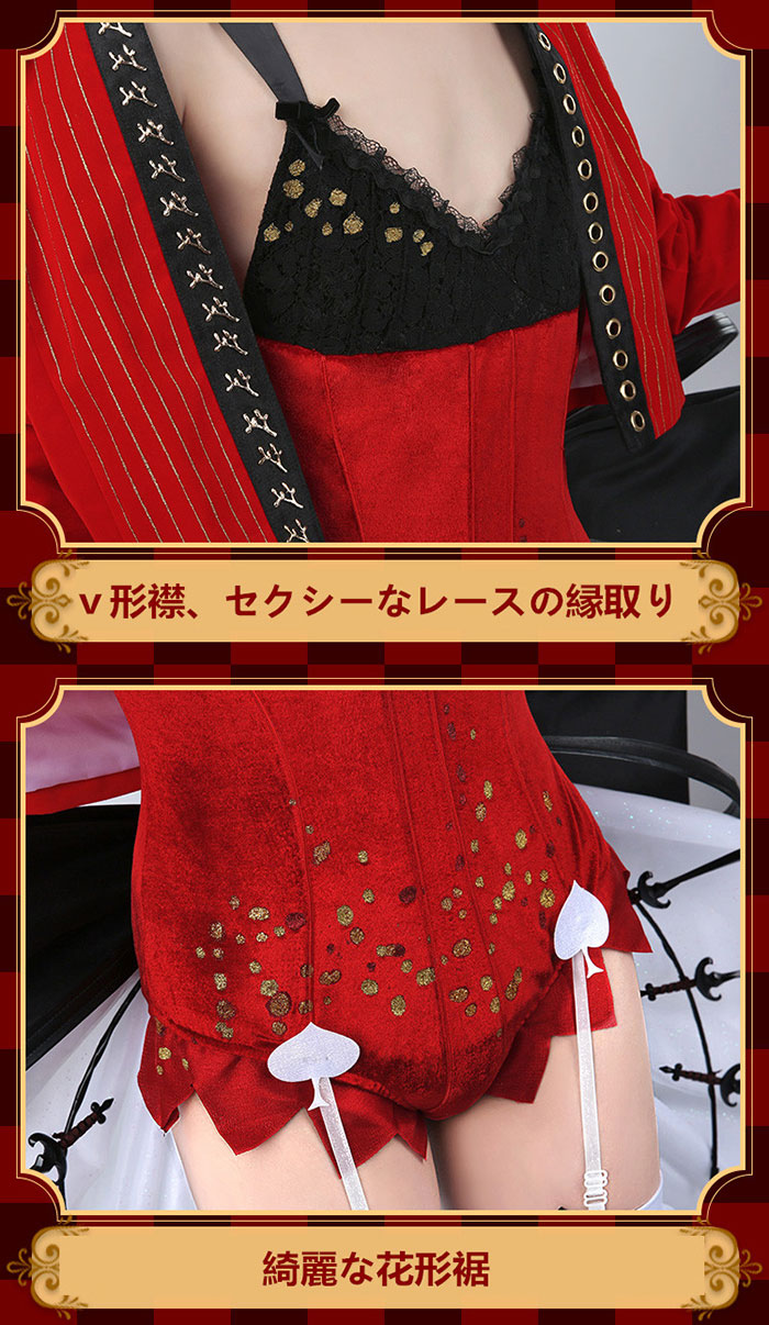 衣装は赤を基調とした華麗礼服、下着はキャミソール式のジャンプスーツ、V襟のデザインとてもセクシー、胸部は黒いレースの素材を採用です、綺麗ピコットの裾を付ける。短いの赤いコートは黒い襟がある、金属の飾り付けでいる、袖口は白い平滑な生地を採用で同じ布地の腕首飾りがある。