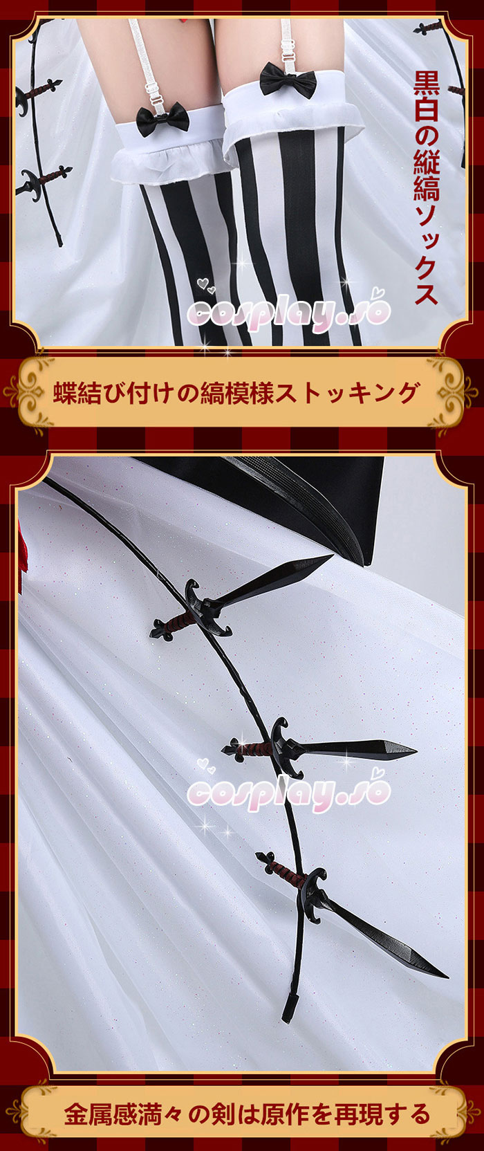 黒白の縦縞ニーハイはレース付ける、サスペンダーの端はスペードと蝶結び、すごく特別の飾り。